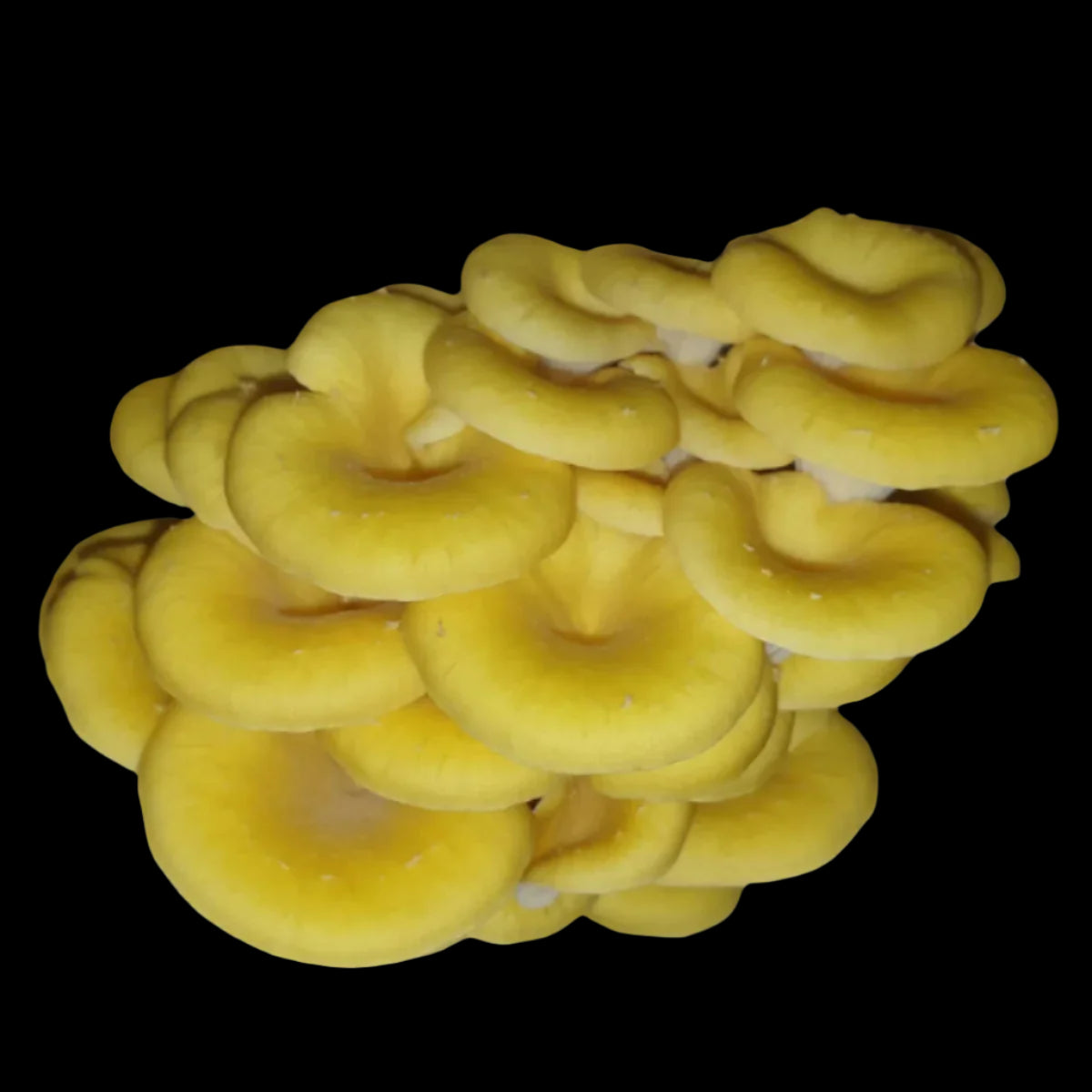 Qualities: Decorative species, slight milder taste, rapid production. Gold Oyster Mushroom Characteristics: Easy-to-grow Oyster mushroom. Due to their funnel-like shape and yellow colour they may remind you of Cantharells. Tightly clustered fruit bodies (4- 7 cm diam.) are gathered centrally or ex-centrically on a thin stem. For a maximum storage capacity they need to be harvested before the full development of the cap sides.